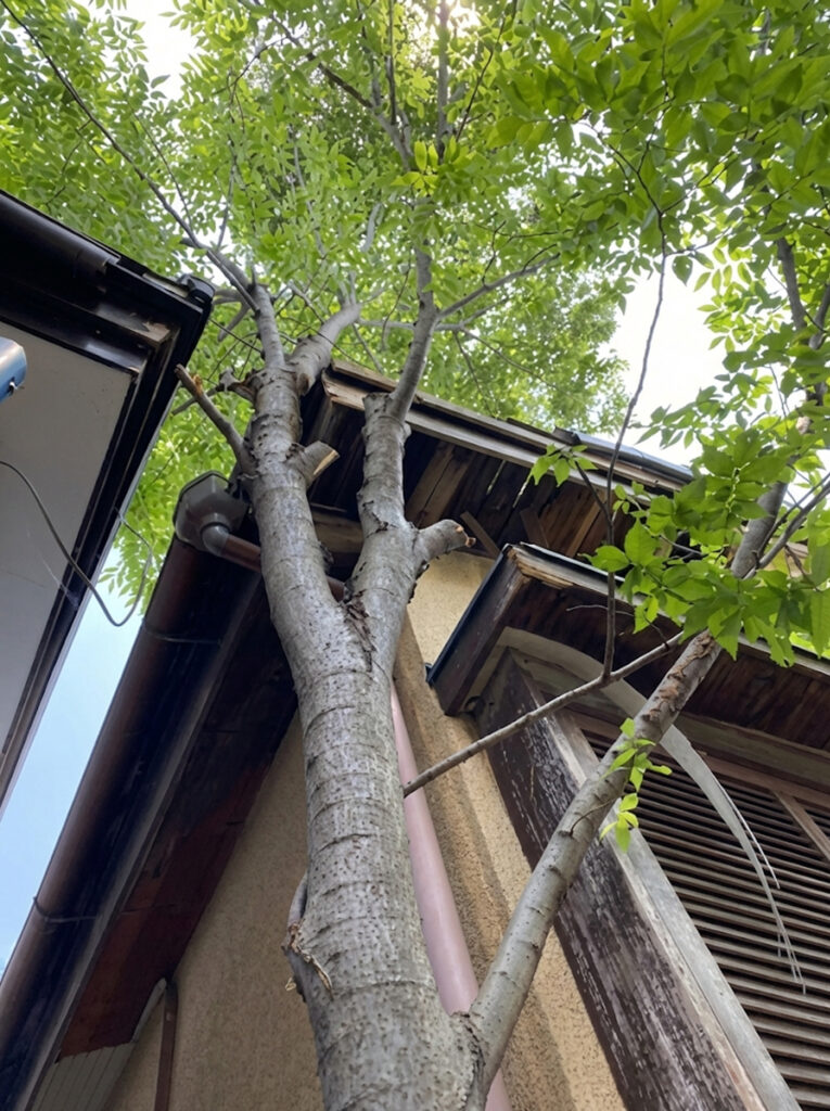 樹木が大きく成長し、ご自宅の屋根や外壁に接触している状態でした。また、隣接する建物との隙間が非常に狭く、ご自身での伐採や枝の管理が困難になっていました。